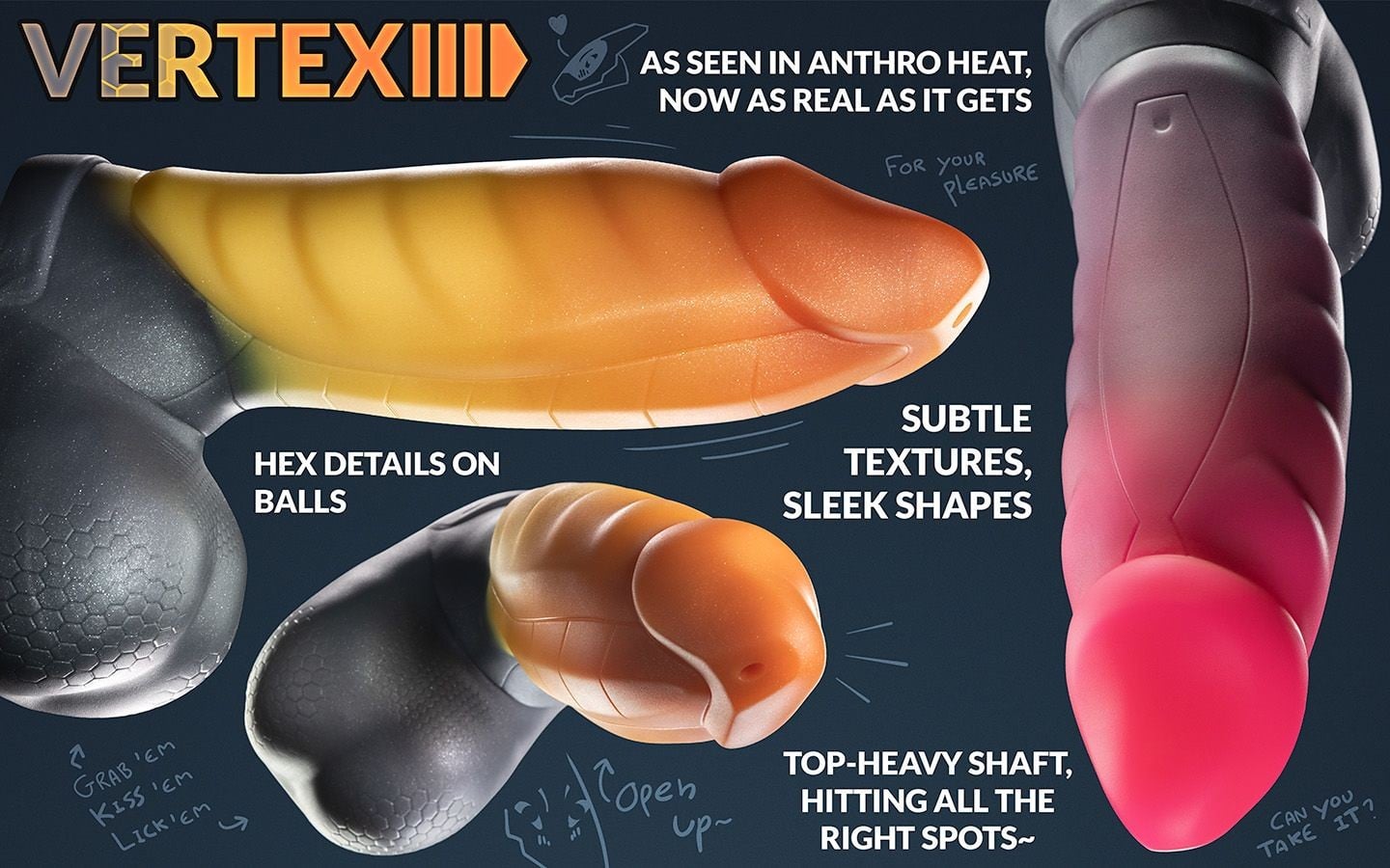 Weredog v spolupráci s postavami z hry AnthroHeat vám prináša hračky, ktoré môžete preniesť z hry do reálneho sveta. Dildo je ručne vyrobené z najkvalitnejšieho silikónu v signature farebnej kombinácii. Má neodolateľný zamatovo jemný povrch a je neuveriteľne ohybné. Rebrovitý povrch poskytuje maximálnu stimuláciu. Celková dĺžka 18,1 cm, použiteľná dĺžka 15,8 cm, priemer 4,6–5,5 cm. Špecifikácie: mäkké (Soft). Viac informácií