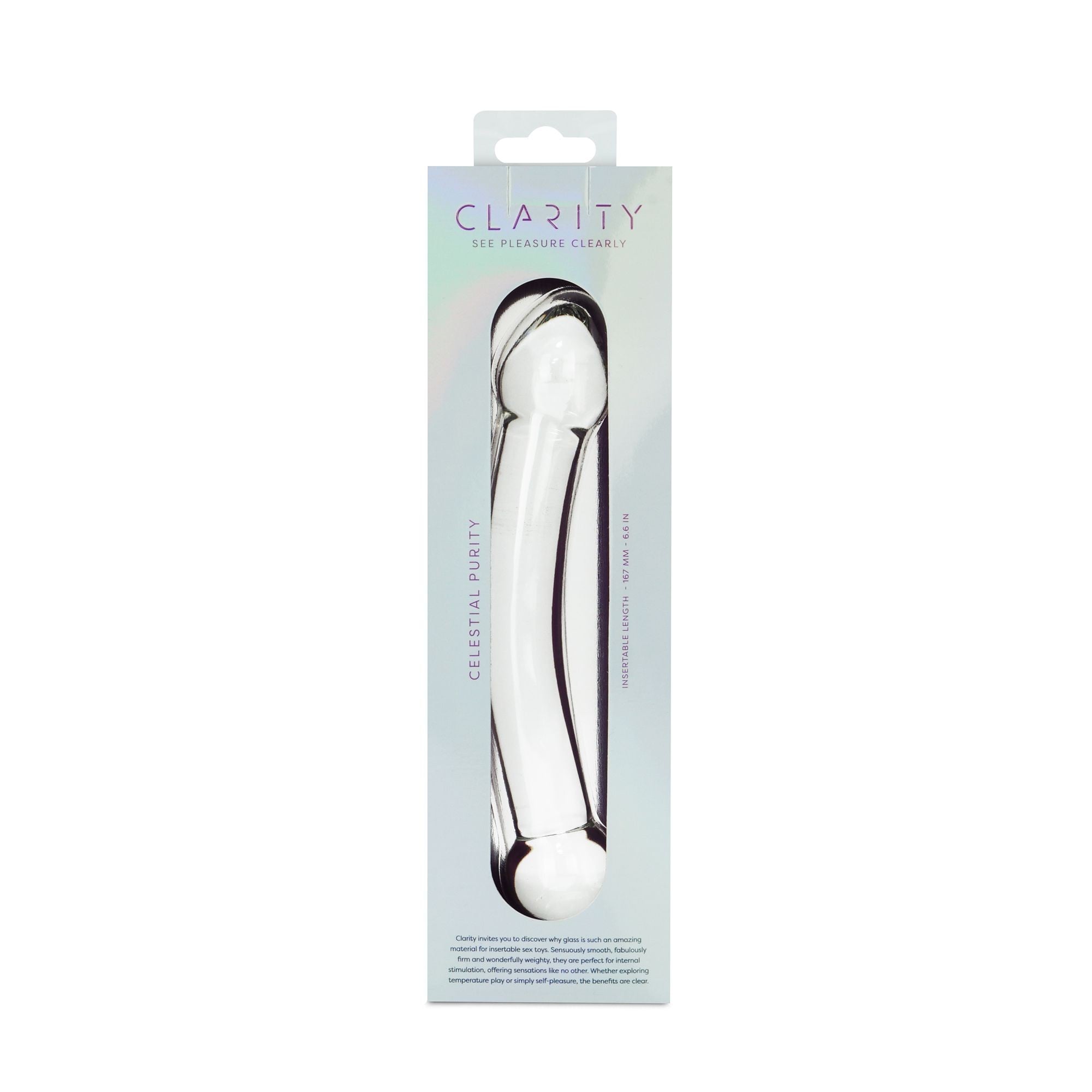 Sklenené dildo Clarity Celestial Purity vyniká svojím čistým dizajnom a premysleným obojstranným prevedením, ktoré ponúka dve odlišné varianty stimulácie v jednej pomôcke.